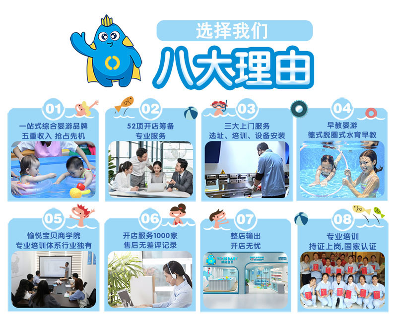 10.愉悦宝贝作为接轨国际前沿的婴幼儿水育早教品牌,拥有先进的设备、专业服务,将为意向创业加盟者提供: 从开店前的店铺选址、设计装修、设备采购物料配送、项目宣传,到开店中的人员培训,管理运营指导......