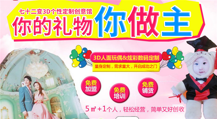 七十二变3D玩偶只需要几千元就能开创自己的事业,广告公司需要它,婚纱影楼需要它,婚庆公司、花店、精品店、会所俱乐部、学校、商场等等都是3D人面玩偶销售的好渠道,随时都可经营。