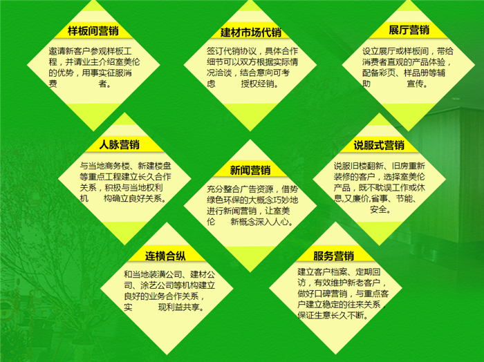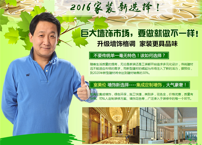 室美伦墙饰,是一种具备多重优点的新型科技环保饰材,全面通过质量监督检测检验,完美实现了低碳、环保、绿色、便捷、品位、时尚,是墙纸加盟、涂料、一般墙饰等传统饰材的全新替代品。
