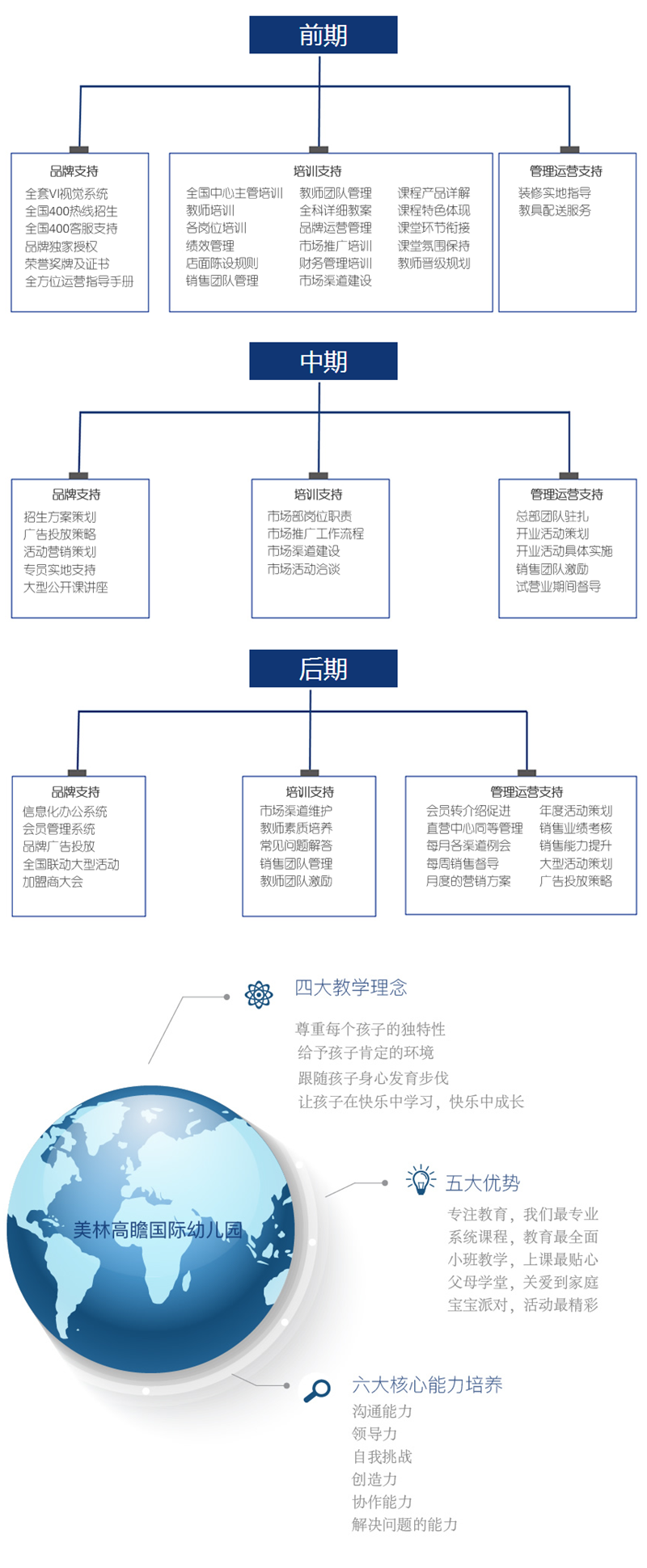 淘宝贝儿童发展中心拥有八大国际排名靠前特色课程:全脑课程(0-2岁)、音乐课程(0-6岁)、 哈佛宝贝(2-3岁)、艺术课程(2-6岁)、思维课程(2.5-6岁)、团队课程(3-6岁)、英语课程(3-6岁);课程均源自美国、欧洲等国际先进课程产品及理念,具有30年以上的成功经验和排名靠前趋势,并通过淘宝贝儿童发展中心整合优化,成为国内独特的全阶段、伴随式教育模式。