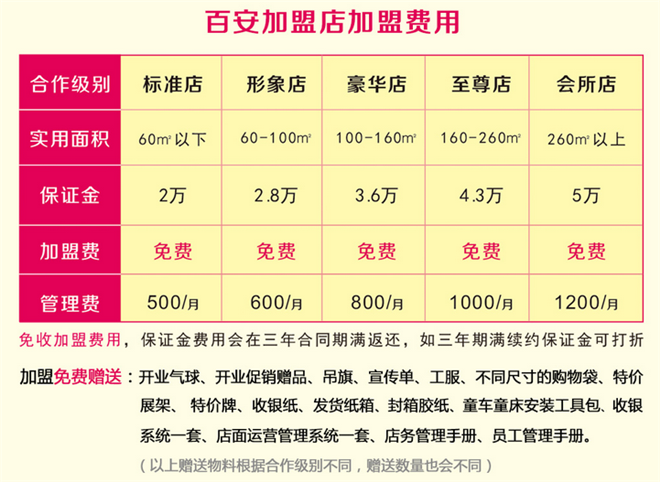 0元加盟费,心动就要行动为更好的服务每个家庭,百安特开通加盟渠道,零加盟费用,让每一个创业者无负担轻松开店。百安母婴商城线上线下同步销售,同时有专业的运营团队并与多家银行合作,加盟商客户只需零负担坐享商城营业额;百安自主开发的商城/微信/店面一体化终端服务系统和门店管理系统让加盟商客户轻松掌握管理数据,为门店的发展提供Zui坚实的后盾。百安总部为加盟商客户提供易懂的简化版管理模式,总部也会结合每个店面的不同情况,量身策划促销推广活动协助店铺更好的运营发展。百安的发展离不开每位消费者及加盟商的支持与厚爱,我们也会不断的提升自己,为大家提供比较好的服务。