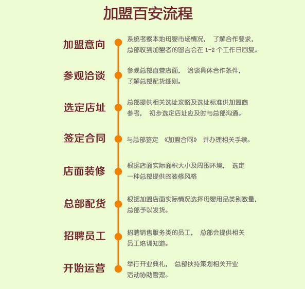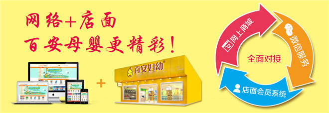 2、家银行战略合作伙伴总部与交通银行、招商银行等多家银行合作,其中有交行Zui红星期五、招商银行邮件推广等多种合作方式,更好的提升了百安的品牌影响力。3、圳总部敏锐的行业嗅觉百安总部立足深圳,始终关注Zui前沿的行业资讯及较新的母婴产品动态,为加盟商客户不断注入新的生命力以提升门店在整个区域的竞争力。4、城/微信/店面一体化终端服务百安自主开发的三位一体终端系统,加盟商可清晰的了解到会员信息、销售库存情况等,为门店的长远发展创造Zui有利的环境。5、主坐享网上商城营业额百安母婴商城是母婴用品折扣商城,线上线下同步销售,证件齐全与多家银行业务合作,加盟商零负担坐享网上商城在自己门店区域的营业额。6、时随地掌控运营数据总部自主开发一套门店管理系统,加盟商可随时随地与总部对接,查看门店的运营、促销及库存情况,为门店的长远发展提供Zui有力的支持。