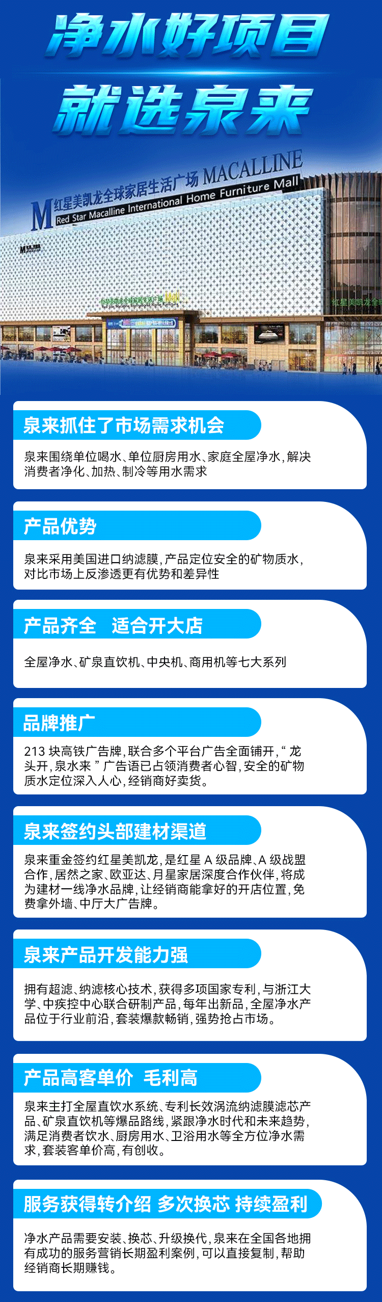 公司在净水领域深耕二十余年,始终坚持“改善水质,服务社会”的企业使命,奉行“创新、积极响应,专业 、值得信赖”的核心价值观,以用户需求为导向,注重新产品研发与品质控制。泉来所销售的产品均获得卫生部卫生批件和检测报告,其品质深受消费者的信赖和业界认可。