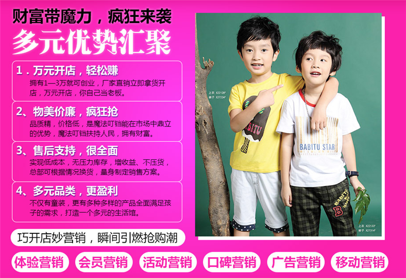 魔法叮铛童装不仅有童装,更有多种多样的产品全面满足孩子的需求,打造一个多元的生活馆,也为投资者提供一个更丰富的Yin利模式,让财富仿佛带有魔力,疯狂来袭!魔法叮铛童装用更全的扶持为投资者全程保驾护航,完美解决开店过程中的一切难题,安心坐享收益!想加盟魔法叮铛童装却不懂市场.jpg?没关系,这里有超全面的营销策略,让投资者化身营销大师,种种策略并用,新店刚开便成为市场大热门!